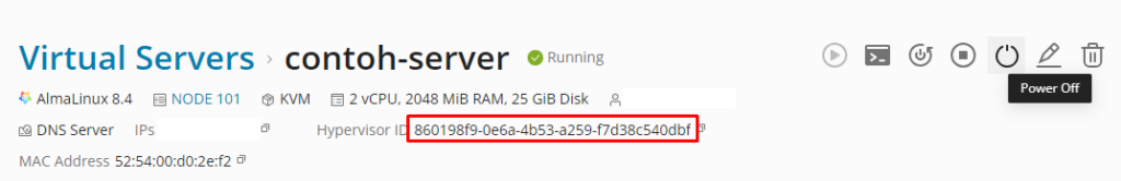 Keenam, login ke Management Node SolusVM 2 dan matikan mesin VPS yang akan di restore pada menu SolusVM 2 > Virtual Servers, kemudian cari mesin yang akan dimatikan dan klik poweroff.