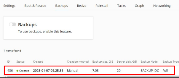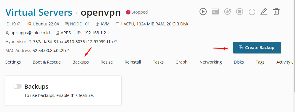 Pertama login dulu ke dashboard solusvm2, kemudian cari server yang akan di migrasikan. Lalu cari menu backup, lalu klik create backup. Contoh